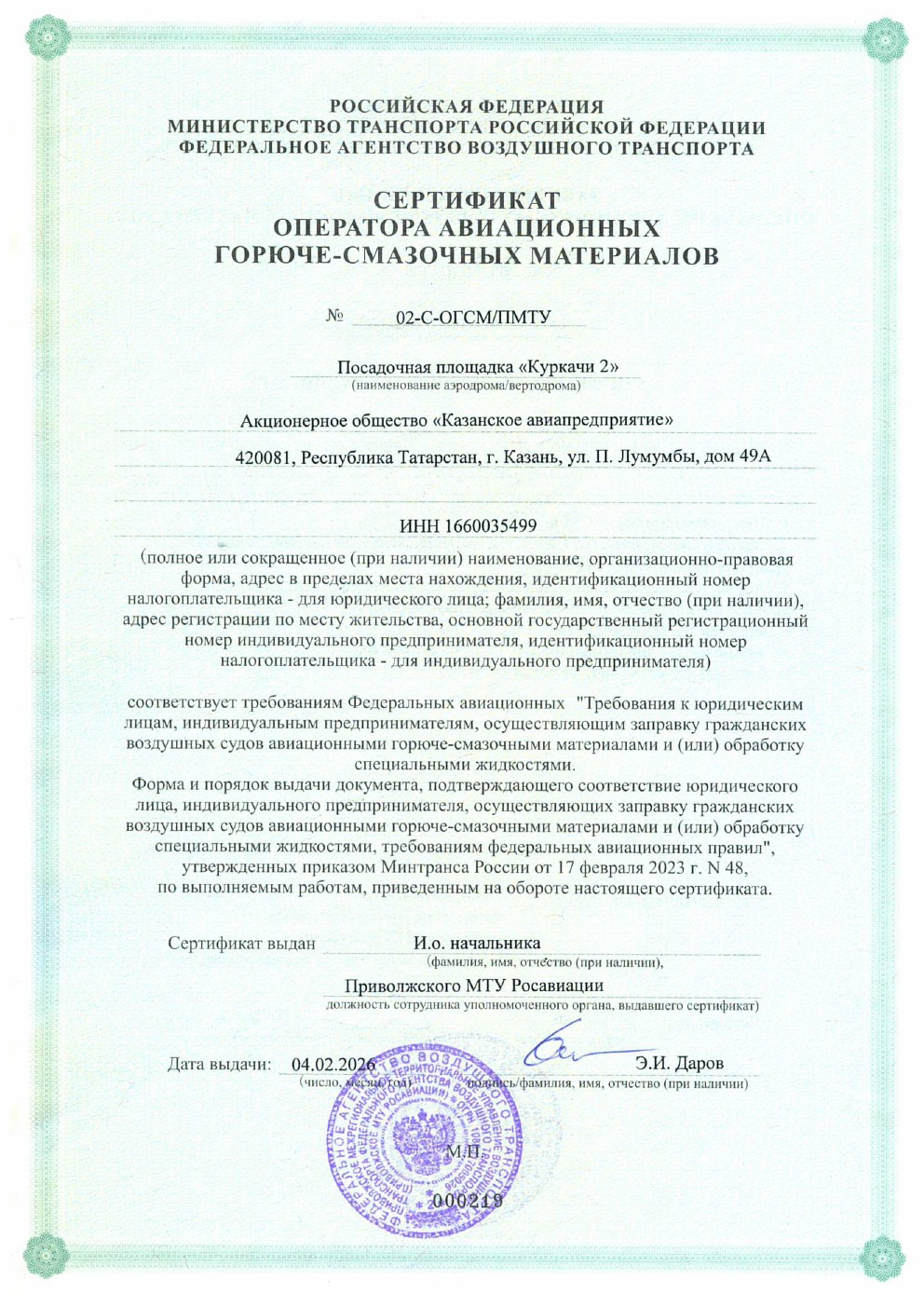 4 февраля 2026г. АО "Казанское авиапредприятие" получило сертификат оператора авиационных ГСМ в соответствии с требованиями ФАП-48.