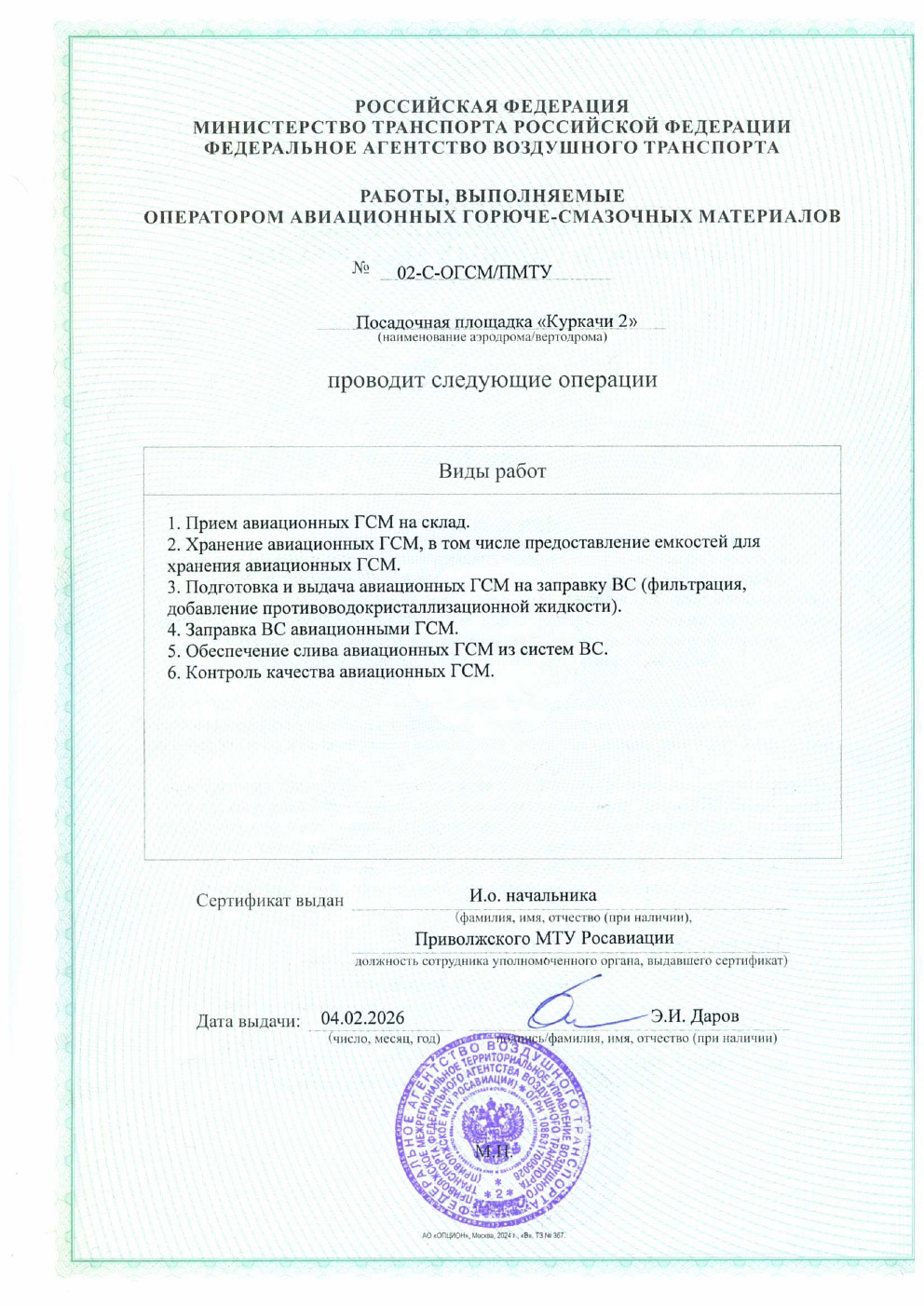 Cертификат оператора авиационных ГСМ